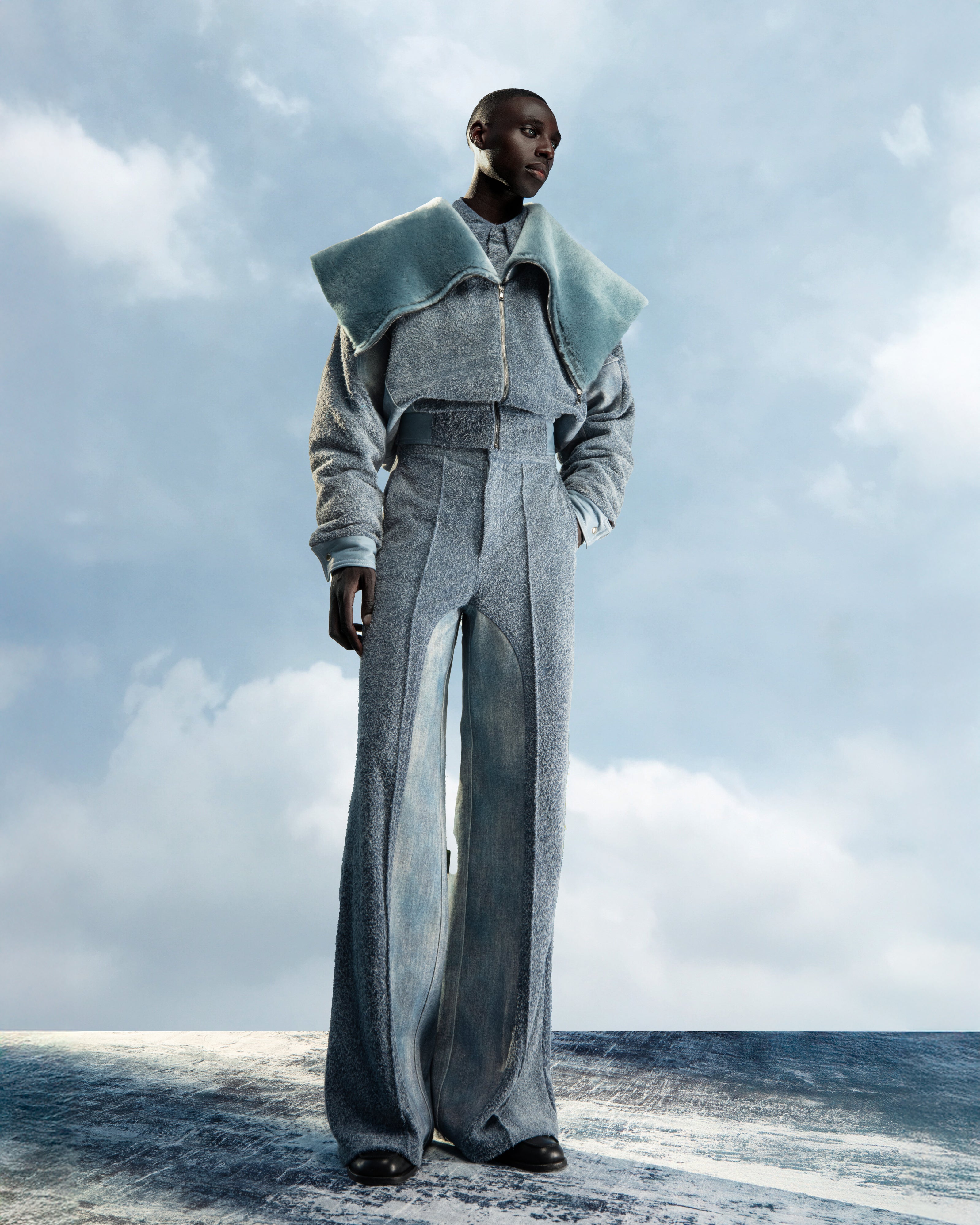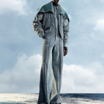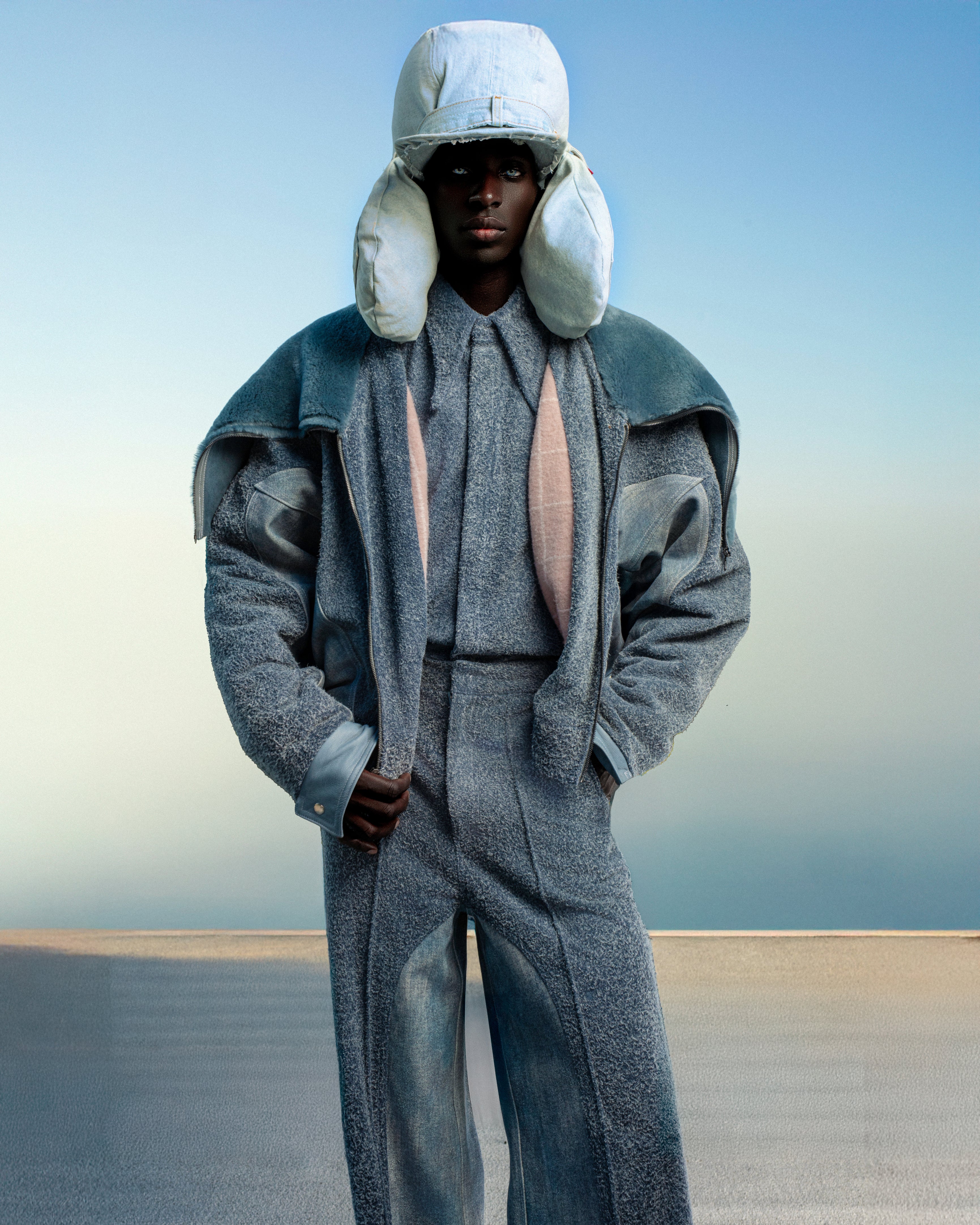 - Denim ironed straight hair shearling oversized collar with functional zippers for styling