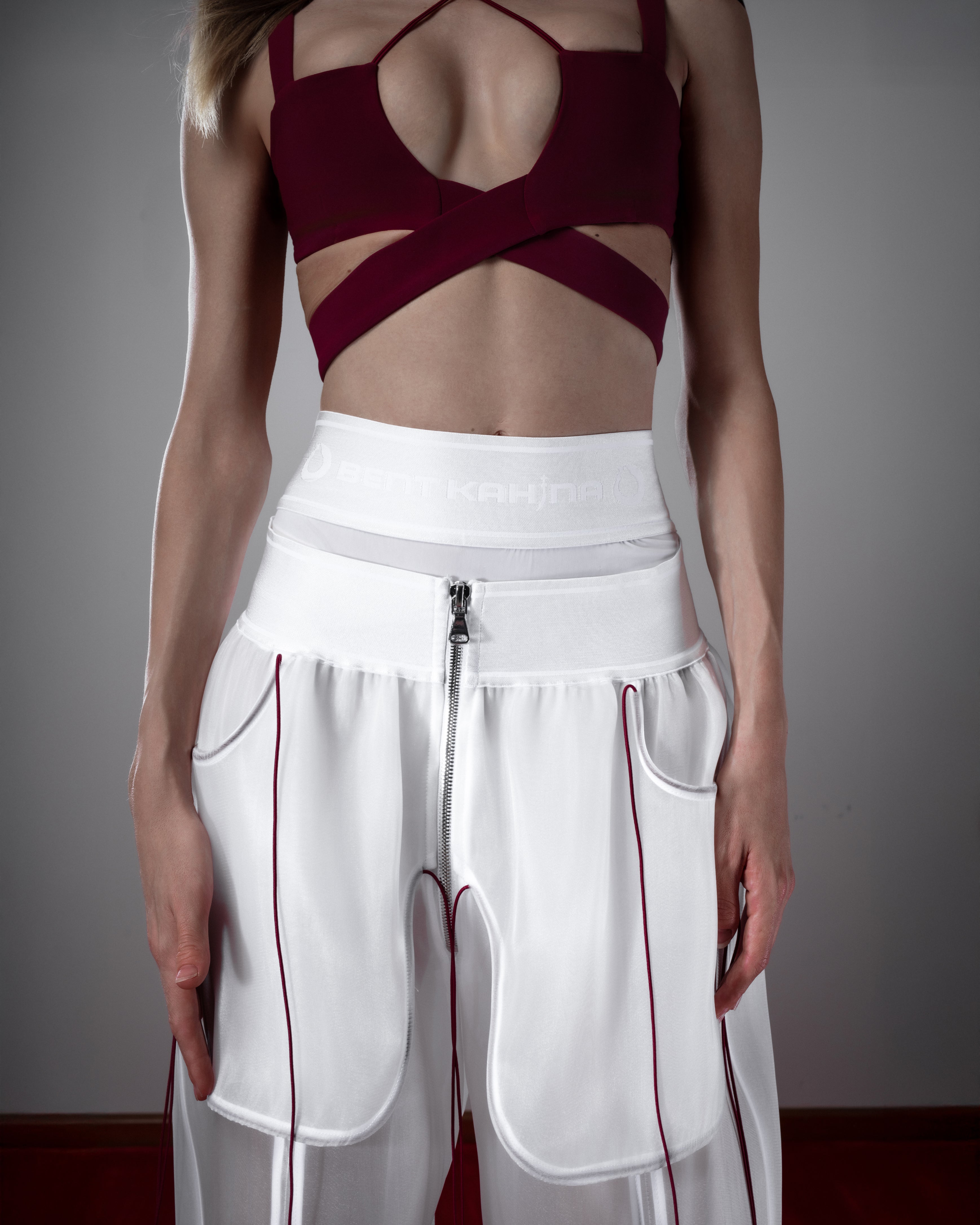- Burgundy colored adjustable criss-cross bungee detail with gunmetal cord ends